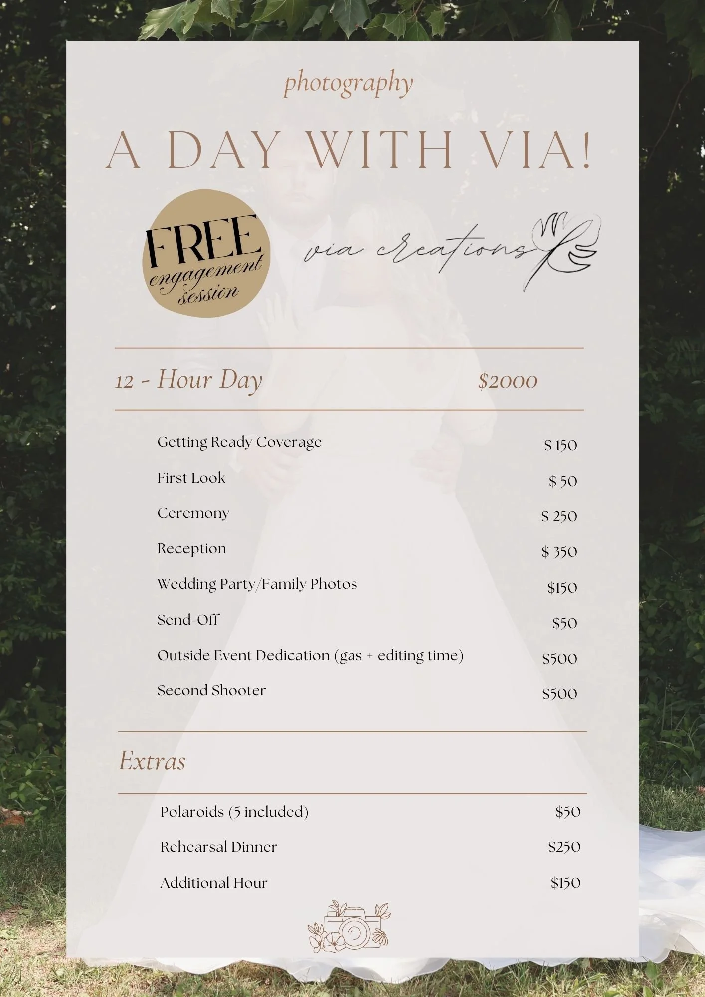 Wedding Packages WEDDING APPLICATION Photography Packages - 6 hour and 8 hour Photography Package - Full Day Coverage Videography Packages -6 hour and 8 hour